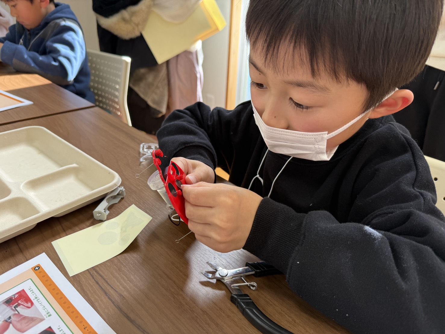 メカニックコースのぷるぷるキツネづくりでは、初めて使うニッパーとドライバーに苦戦しながらも目の前で組みあがっていくロボットにワクワク!!