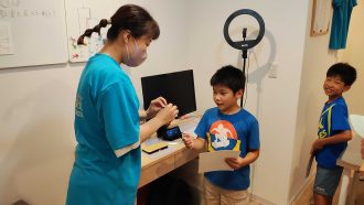 動作チェックでモーターにコードをつなげてモーターコマを楽しみました♪