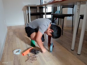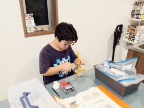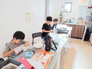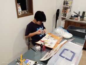 大型ロボットを製作中。ぞれぞれ行う工程が違いますが、集中して製作している子ども達。