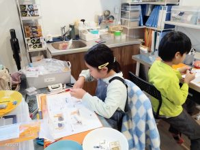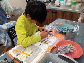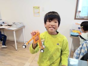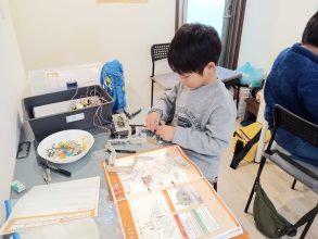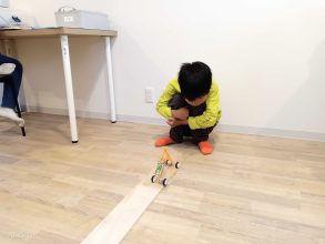 しゃくとりむしロボットを製作している子は、完成して一本橋レースを楽しんだ後、