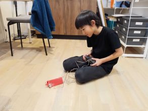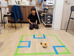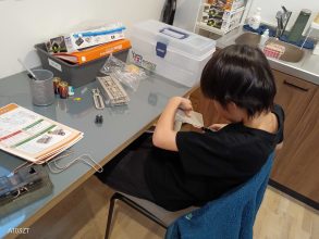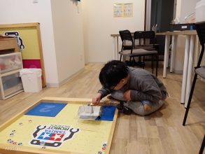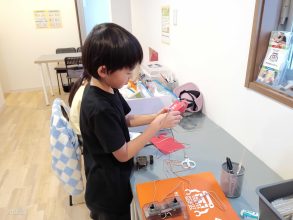 基礎クラスで大型ロボットの改造の続きを製作している子は、おもりの微調整や