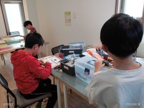 ギヤボックス製作や部品の切り出し、パンタグラフの組み立て、ギヤボックスの仕組みに