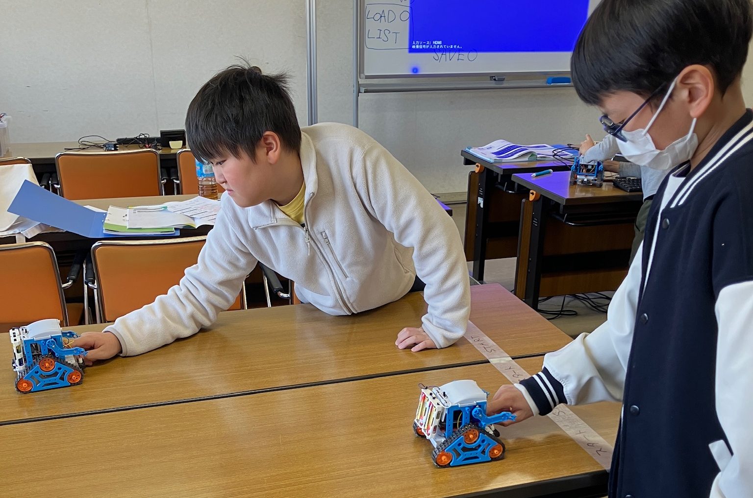 前進させるより、バックさせる方がカムロボのボタン押しやすくね!? ということでプログラムを改造して後ろ向きの競争となりました。
