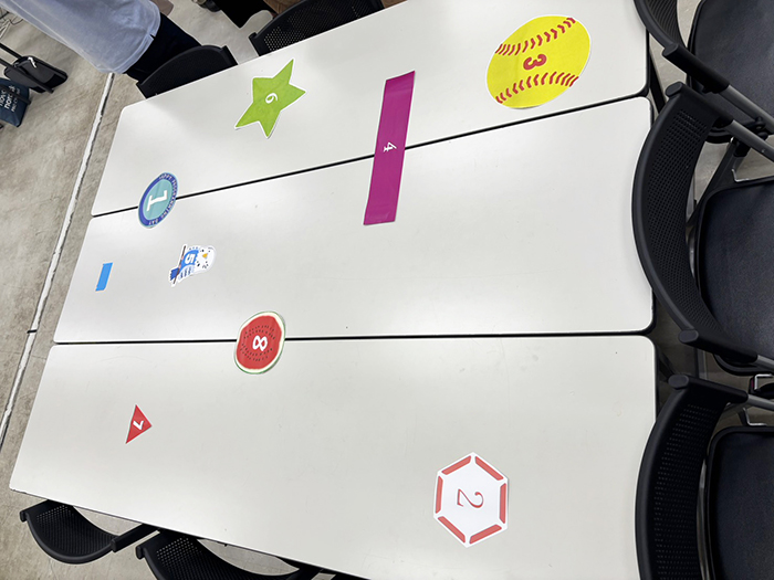 ロボットが青テープのスタートラインから動き出し、数字の書かれたシートの上にピッタリ止まればその番号を埋めることができます。たて、よこ、斜めで埋めることができたらゲームクリアです。