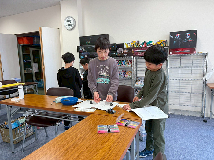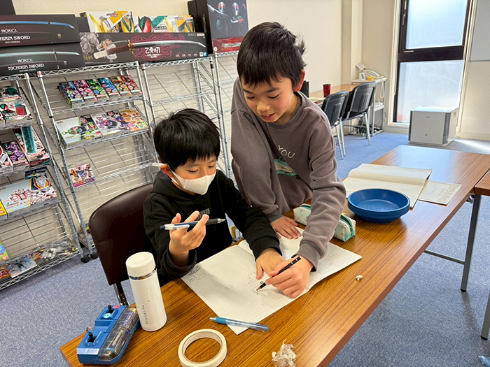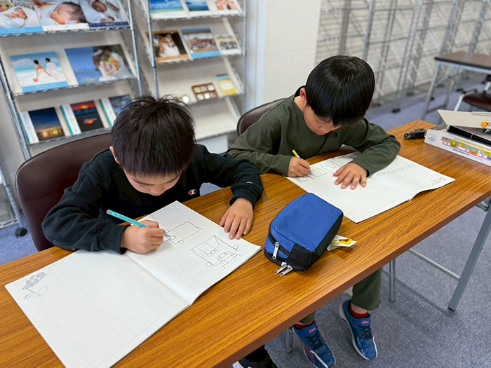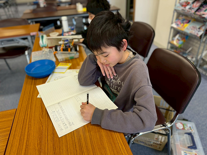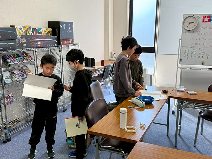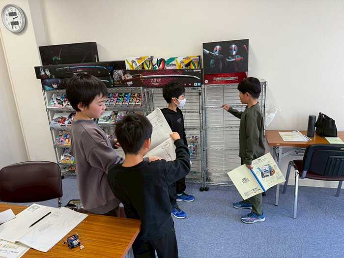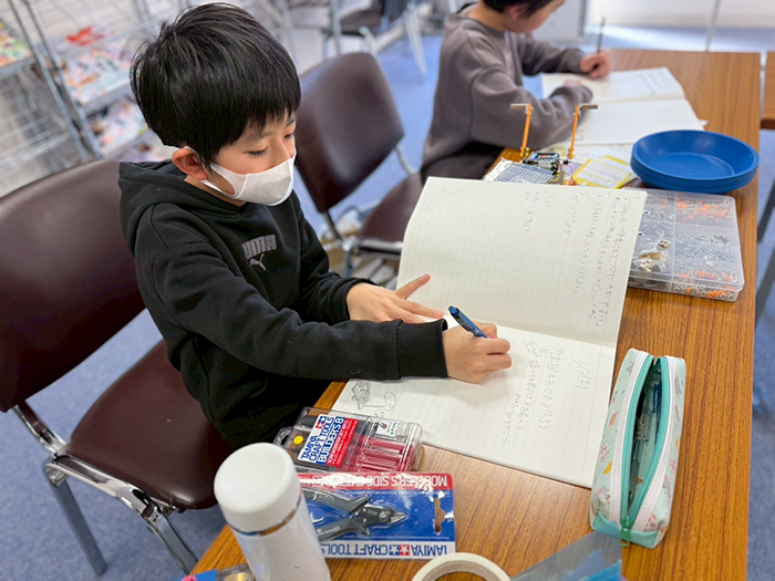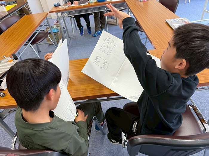 次にチームごとに分かれて作戦を考え、それに合わせてマシンの設計図を書きました。お互いのノートを見ながら、ここをこうしたい、こうしたほうがいいのでは?と活発な意見交換が見られました。