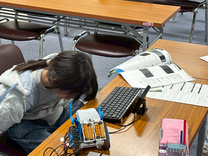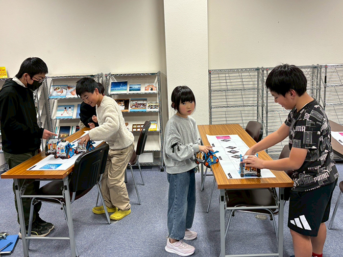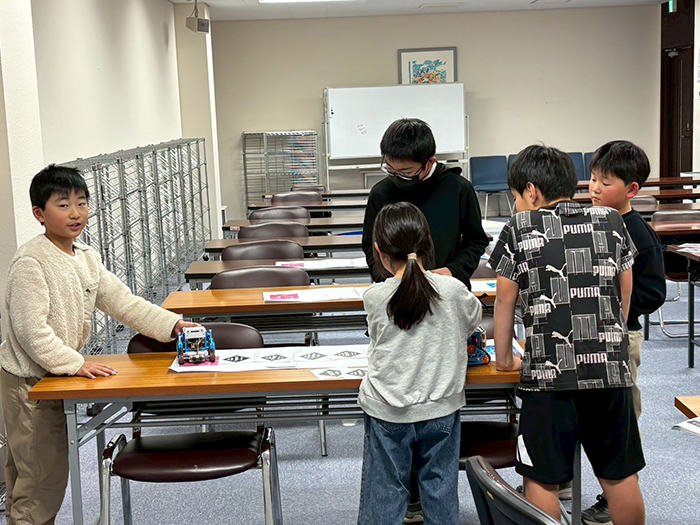最後のすごろくゲームではマスに「1回休み」「1マス進む」などのカードを配置し、ランダムな距離を動くカムロボを使ってどちらが先にゴールできるかの勝負をしました。
