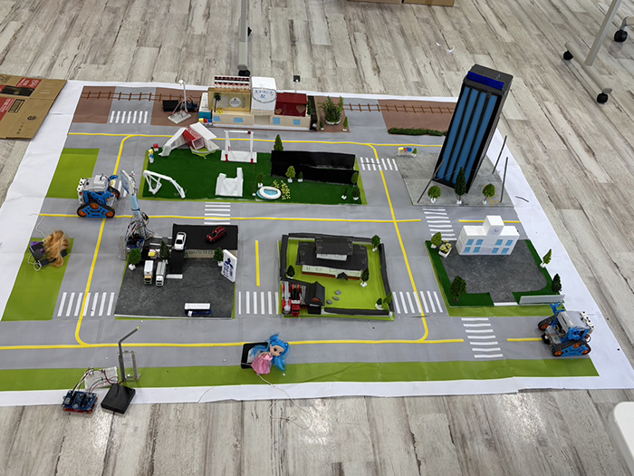 前日に作った自動ブレーキ、街灯、信号機も配置して暮らしやすい街づくりになったね。
