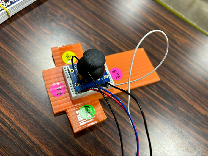 距離センサーは近い遠いを数値で表してくれるので、距離センサーの前に手を置いて「このくらいに設定したら遠すぎず近すぎずで止まることができな…」など考えてロボットの止まる位置を設定してもらいます。