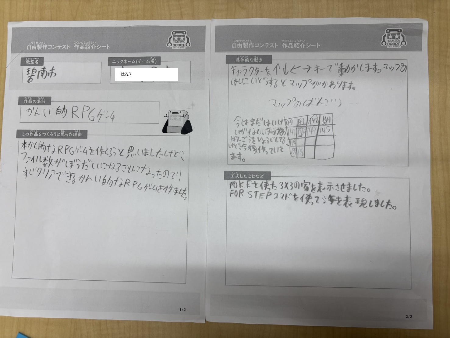 入会当初から「RPGを作りたい」という夢に向かって努力を重ねてきましたね!POKEコマンドで大きなお家を描く斬新な発想や、FOR文・LRUNコマンドを自在に扱う技術力に感心しています。壮大な計画を一歩ずつ形にしていく姿勢は素晴らしく、完成するゲームがとても楽しみです。