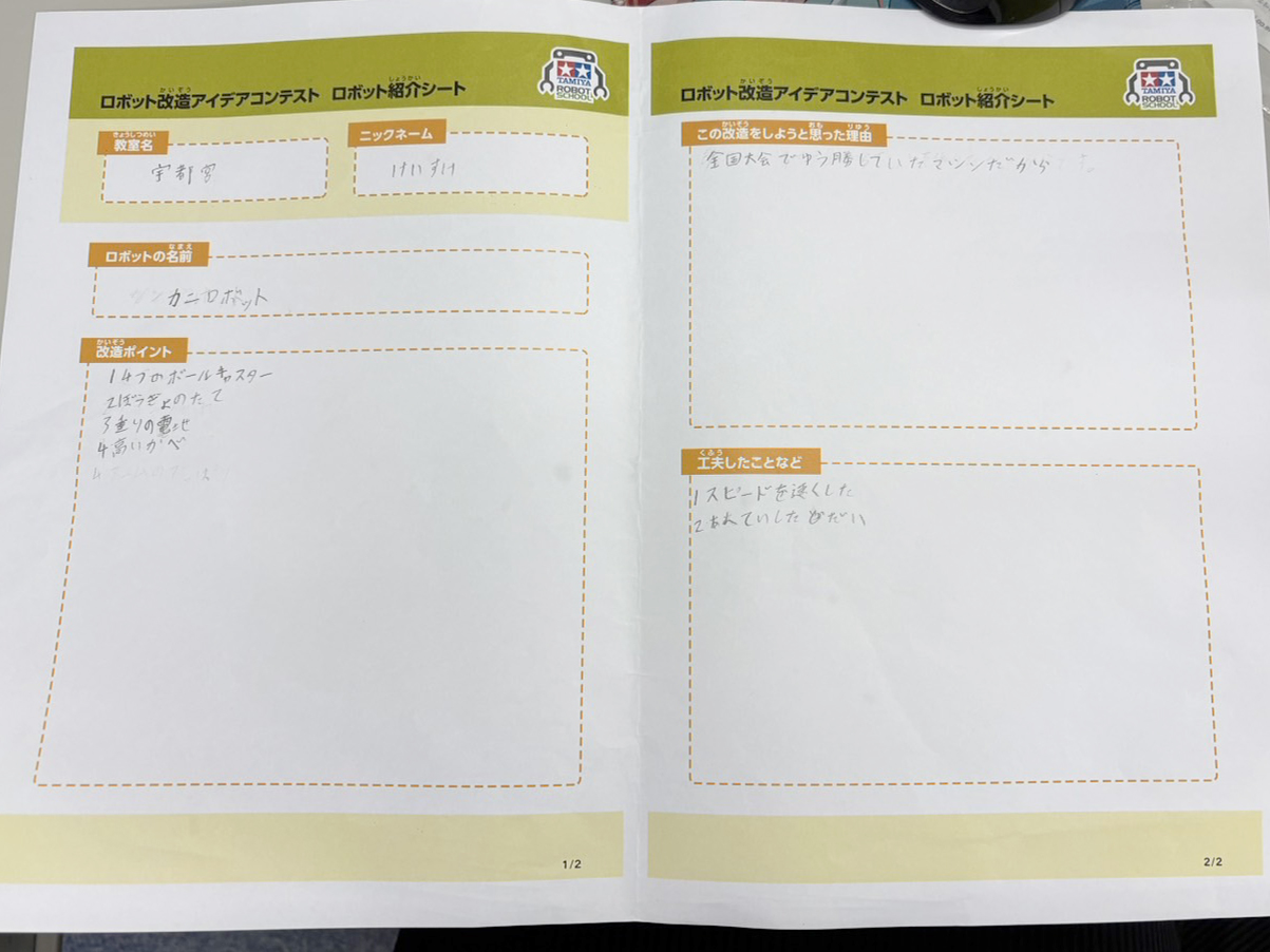 前回優勝したロボットの動きを作れるよう、何度も微調整して作成していました。相手の動きに反応できるよう速度調整をしたり、弾いて落ちたキャップを返されないよう前面にガードをつけたのはしっかりアレンジがきいていて素晴らしいです。