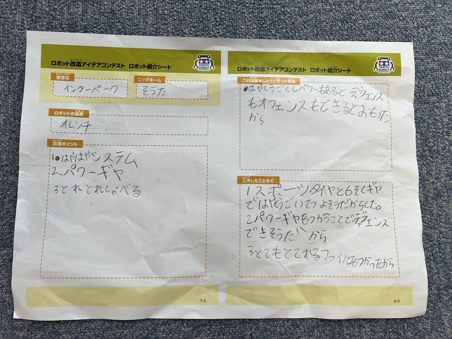 圧倒的な攻撃力で競技台の上を我が物顔に支配するマシーンができあがりました。パワーアップした駆動部分を受け止める強固なボディ、それを操縦する本人の努力が集結したロボットです。つねに上を目指す精神力がロボットにも乗り移っているようなパフォーマンスが見ものです。