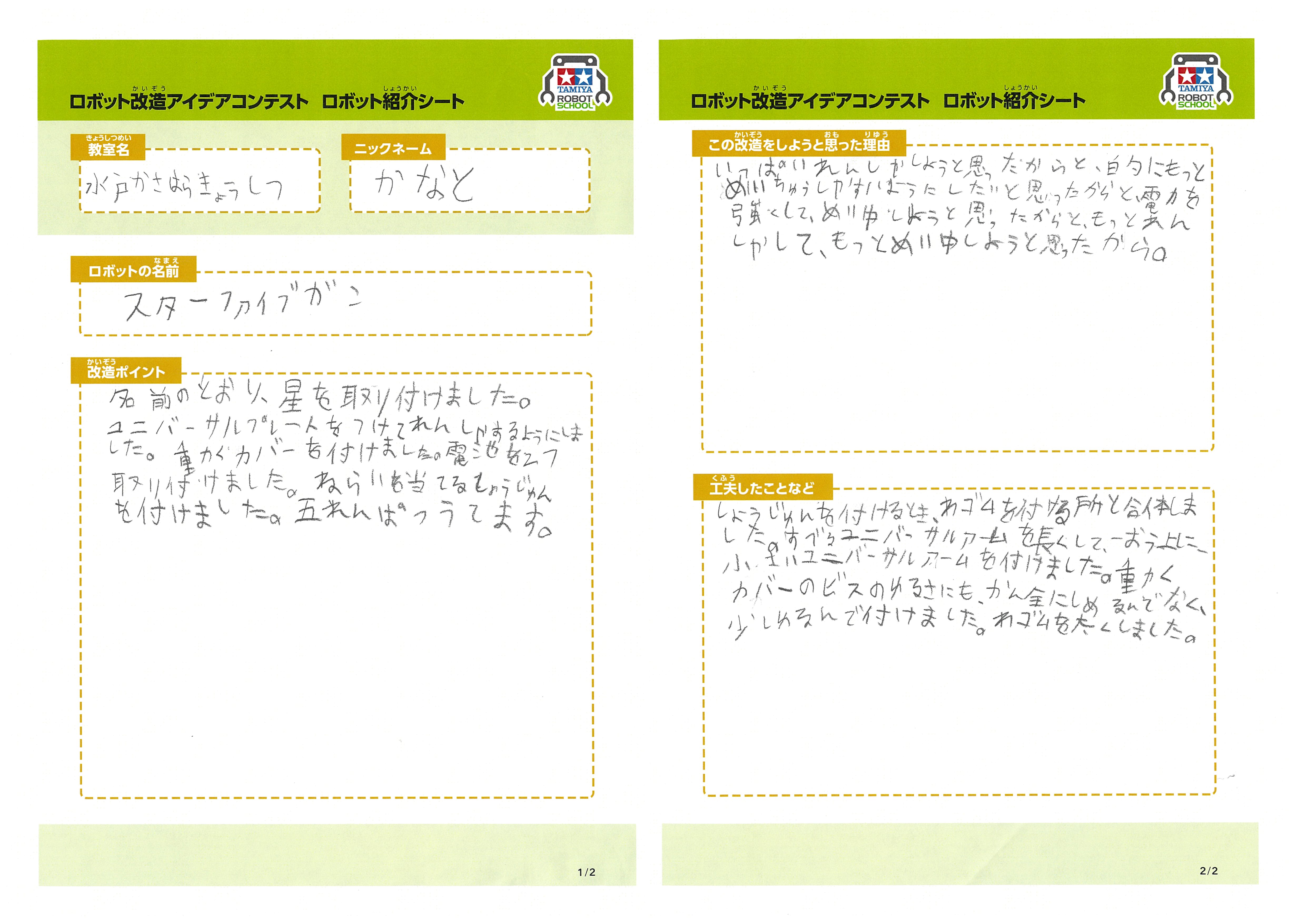 連射性能と発射威力の底上げを狙った改造です。テキストでは、ランチャーを2口にするためのパーツづくりでしたが、それらをキャップを装填するために使いました。キャップがスムーズに流れるように、装填する向きを斜めにしているのもポイントです。短い時間のなかで、試行錯誤し5発連射と教室内で1番連射数が多くなっています。また、パワーとスピードアップを計り電池を2つにするなどテキストに無いところまでチャレンジしている試行錯誤の結晶です。