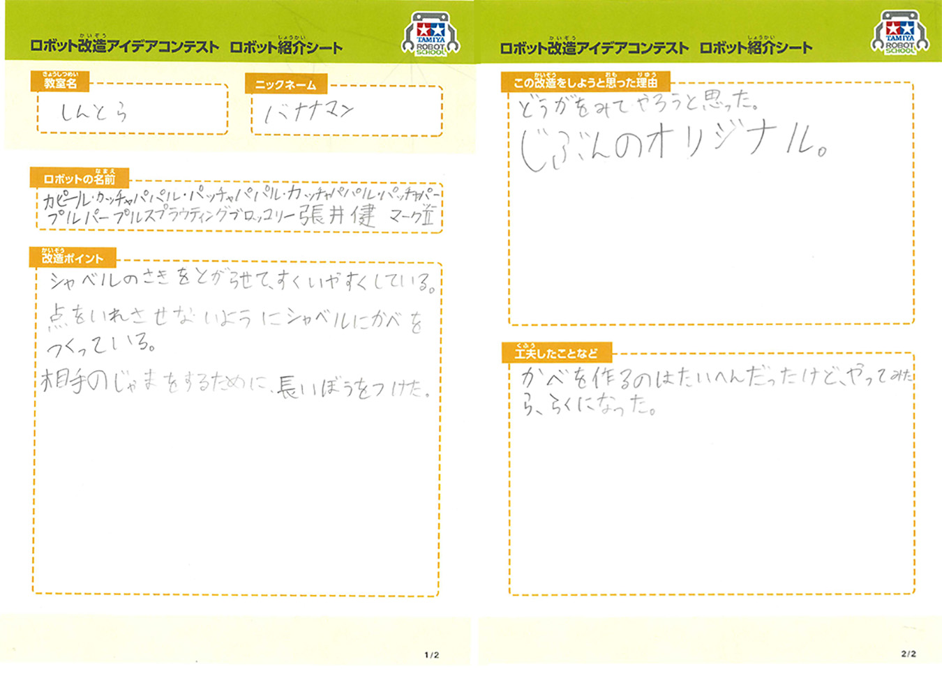 まずは、長いロボット名に注目です。すくいあげたペットボトルキャップをスムーズにバケットに流し込むために黒いプラダンを利用しています。バケットの先端に付けた長い棒は、開始時にすばやく1点のキャップを落とすことと、相手を妨害することを目的に付けられています。教室内の対戦でも、キャップを流し込もうとする相手のバケットを押さえ込むなどの役割を果たしていました。